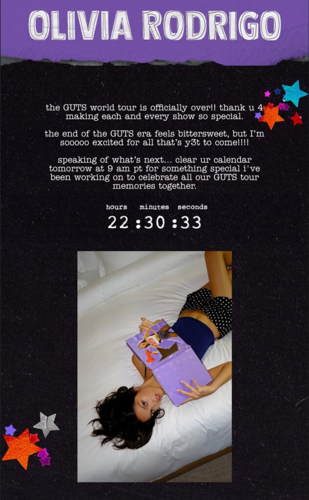 Olivia Rodrigo teases her new album during the “GUTS World Tour.” Rodrigo has also updated her website ahead of her new era. Rodrigo officially wrapped the Guts era on Aug. 3, 2025, at the Osheaga Festival in Montreal, Canada.